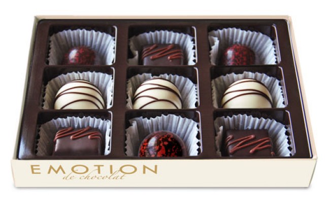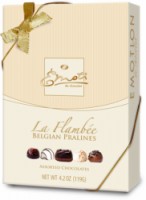 Výběr belgickcých pralinek Emoti z mléčné a bílé čokolády s  kávovou náplní ganache, s čokoladovým moussem  a karamelovou náplní.   Dárkový obal se zlatou mašlí.